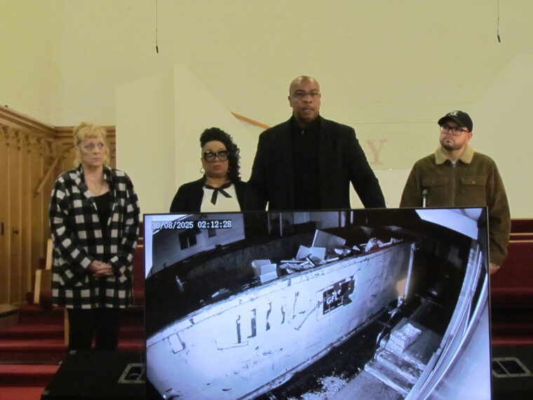 Featured photo: Councilwoman Tonya Burns speaks as video footage is shown of a recent firebombing at St. Mark Baptist Church