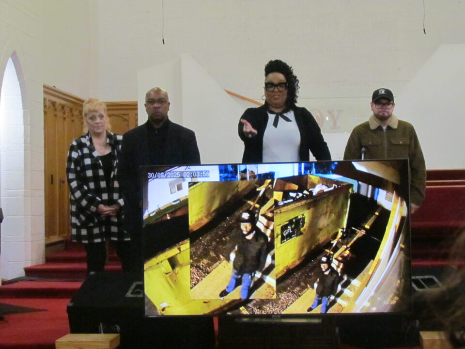 Featured photo: Councilwoman Tonya Burns speaks as video footage is shown of a recent firebombing at St. Mark Baptist Church