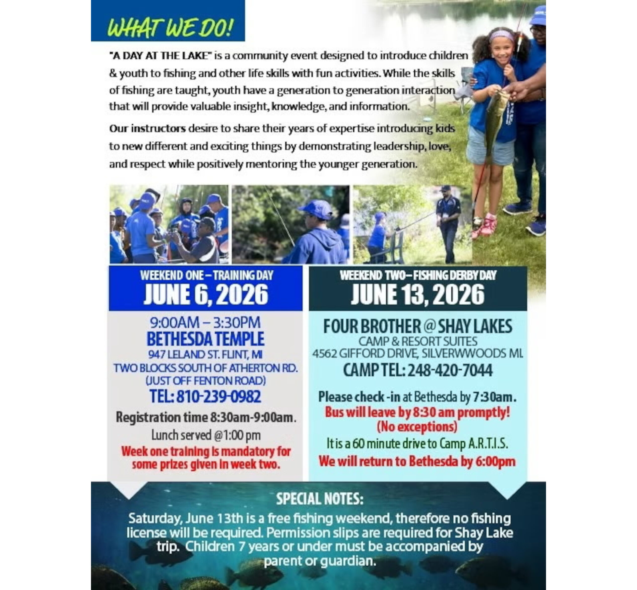 On June 6, from 9 a.m. – 3:30 p.m., training day begins at Bethseda Temple, at 947 Leland St., in Flint, during weekend one. Weekend one training is mandatory for some prizes given during weekend two.
