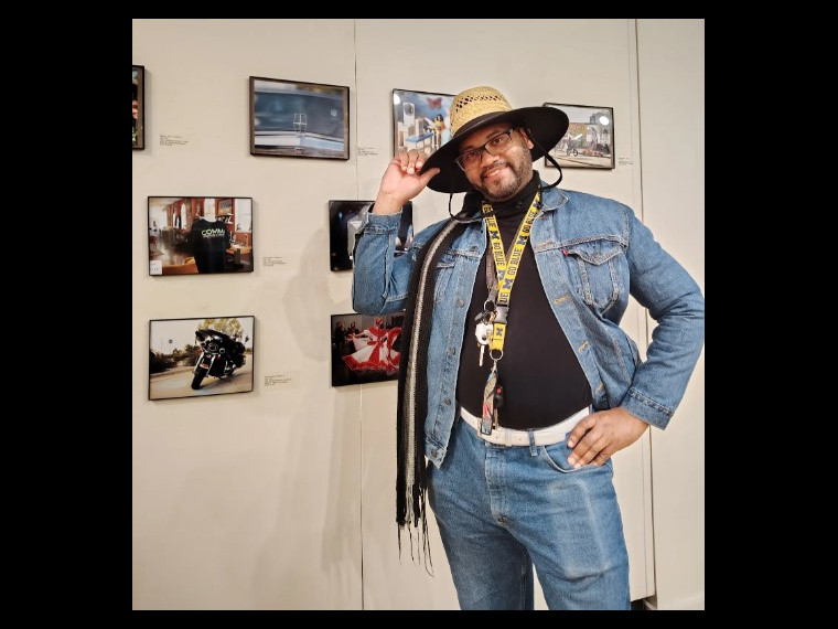 Alvin Brown, Jr. in front of his collection of photographs.