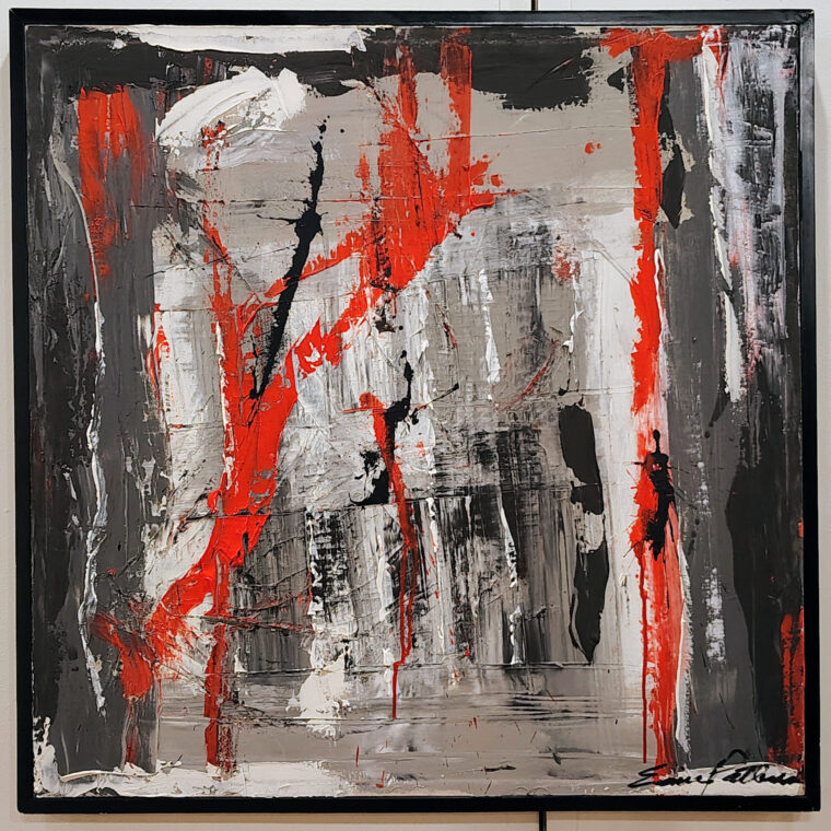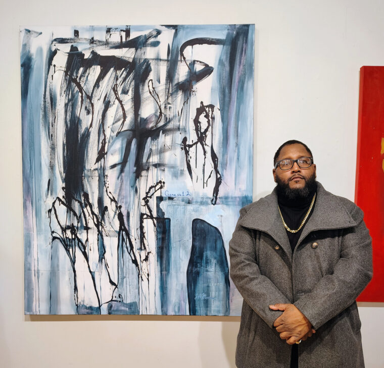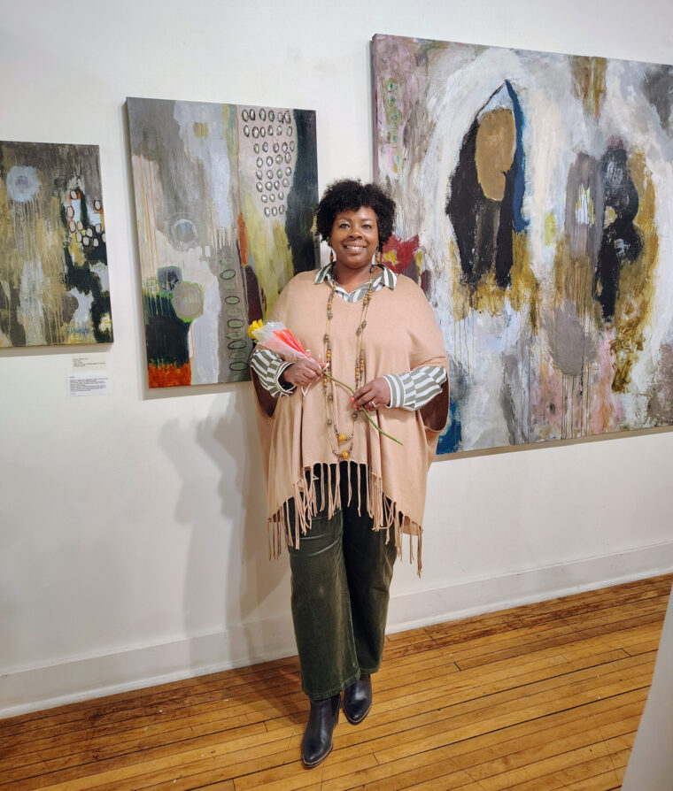 Regina Dnnn in front of her abstract paintings, acrylic.