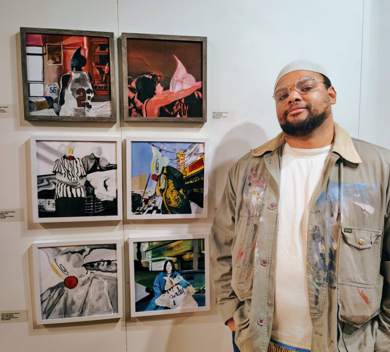 The Art School Dropout in front of a collection of his acrylic paintings.