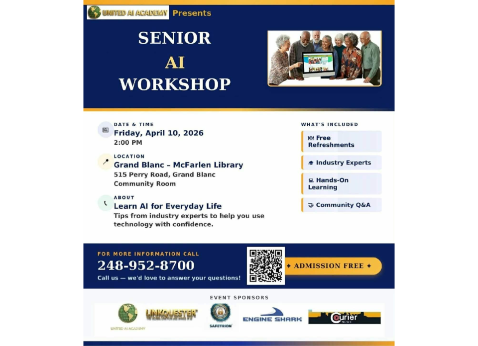UNITED AI ACADEMY™  is hosting a Senior AI Workshop. The workshop will take place at 2 p.m., on Friday, April 10, in the Community Room, at the Grand Blanc McFarlen Library.