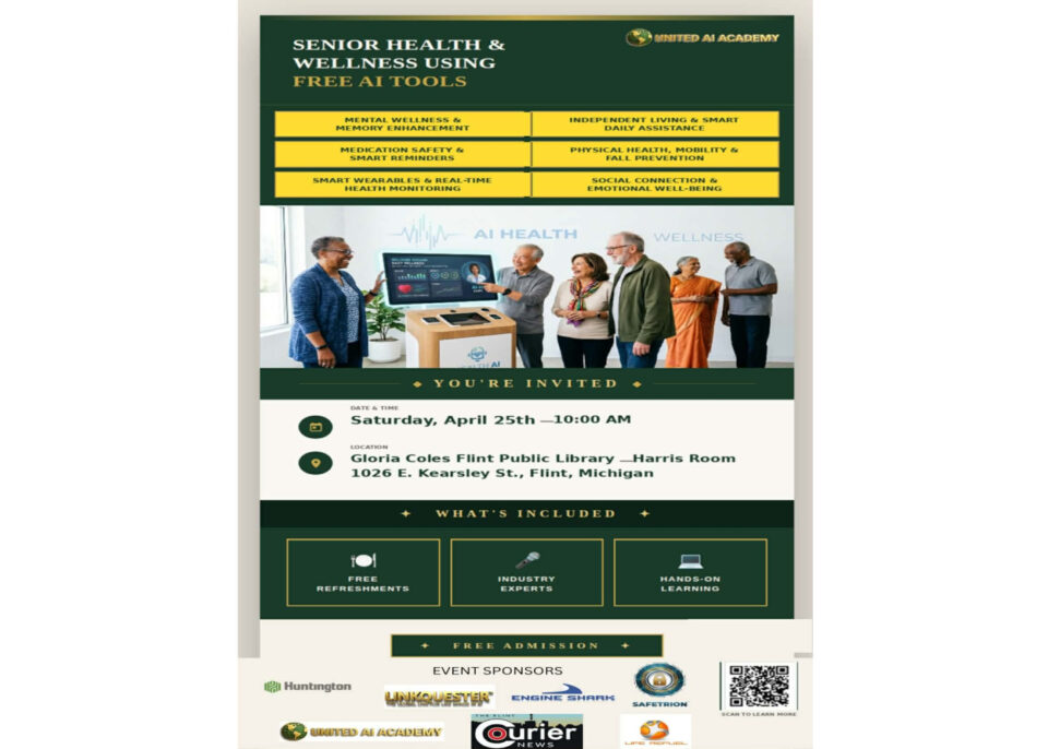 United AI Academy is presenting a Senior Health & Wellness Using Free AI Tools at 10 a.m., on Saturday, April 25, at the Gloria Coles Flint Public Library!